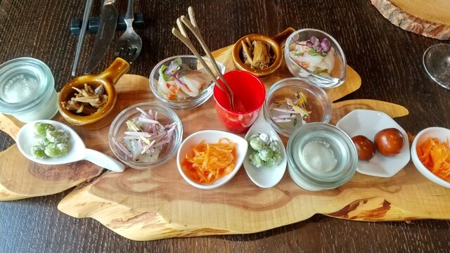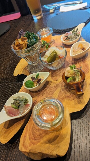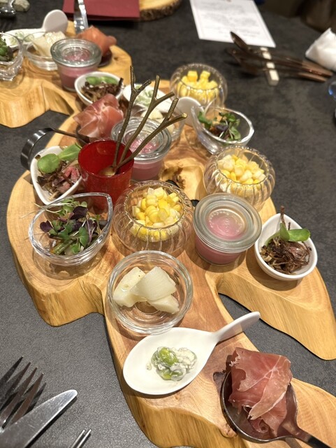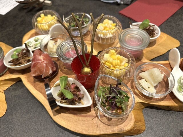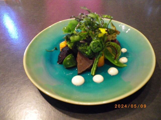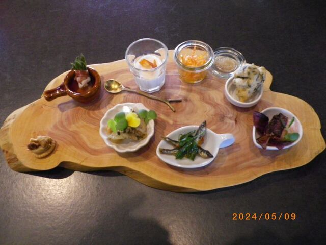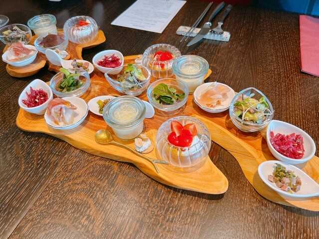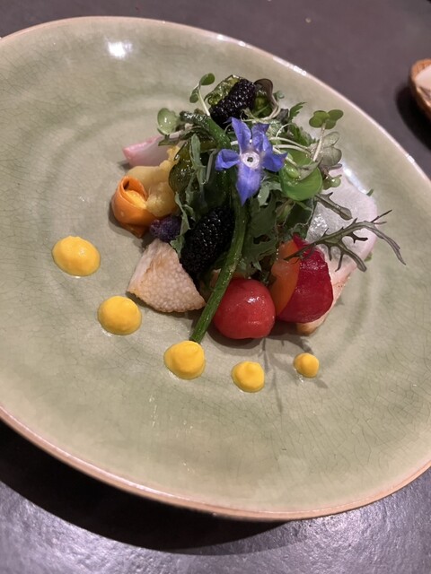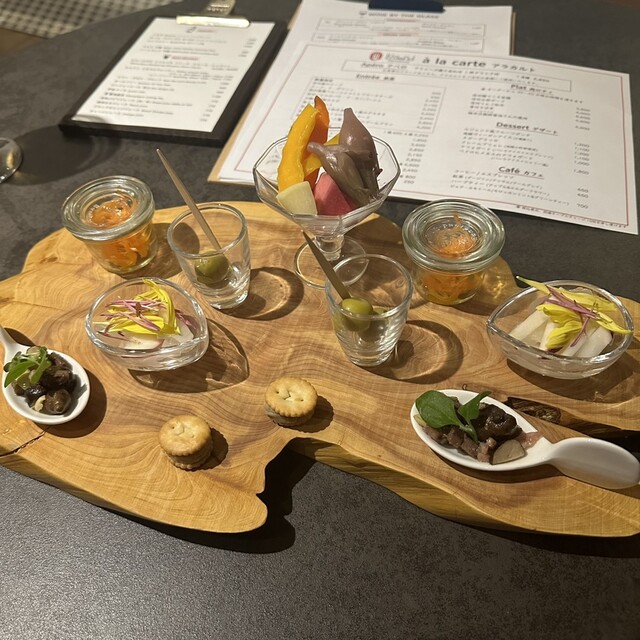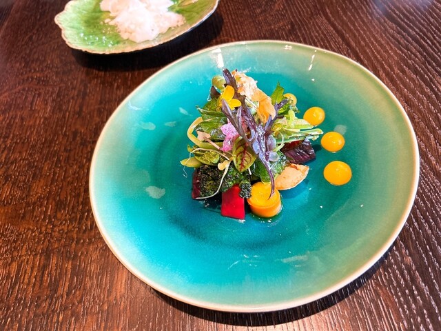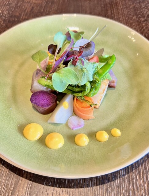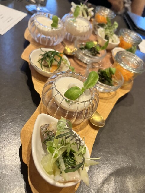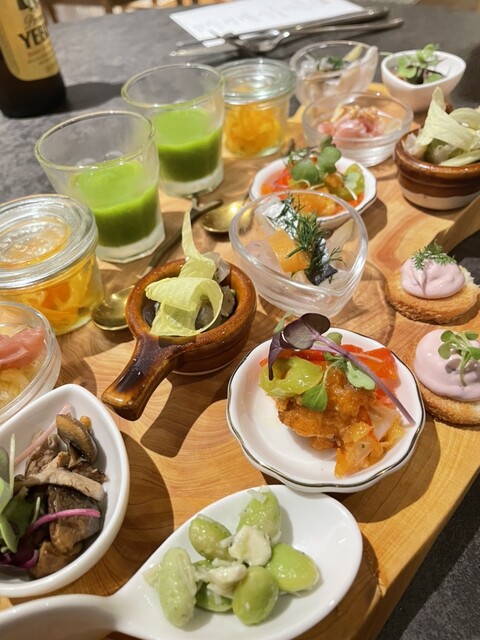 ディナーコース6,600円をいただきました。前菜8種が美しく、一つ一つがとても丁寧に工夫して作られていました。新玉ねぎのムースやオレンジ風味のキャロットラペ、そして自家製のパテドカンパーニュもとても美...