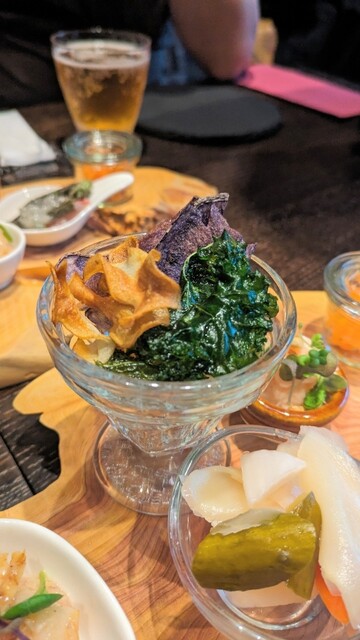 季節の食材を用いたアミューズに野菜のチップスが付いています