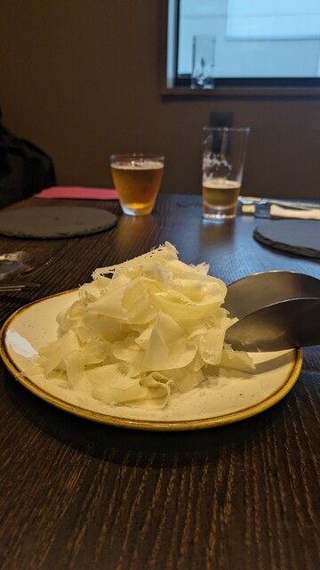 スタッフのお姉さんが削ってくださいます、こちらのチーズは4〜6か月熟成 した チーズの塊から、専用の ナイフ でこすり取って、非常に薄い花びら状にして提供されます