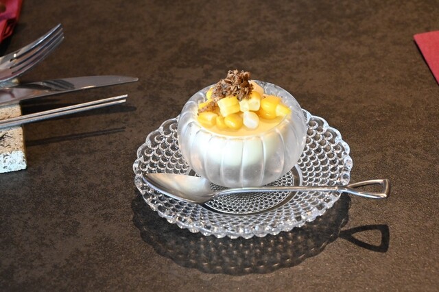 一皿めはムース。夏らしくガラスの器で提供されて一見デザートの様。サッパリと感じるものの味わい深い。