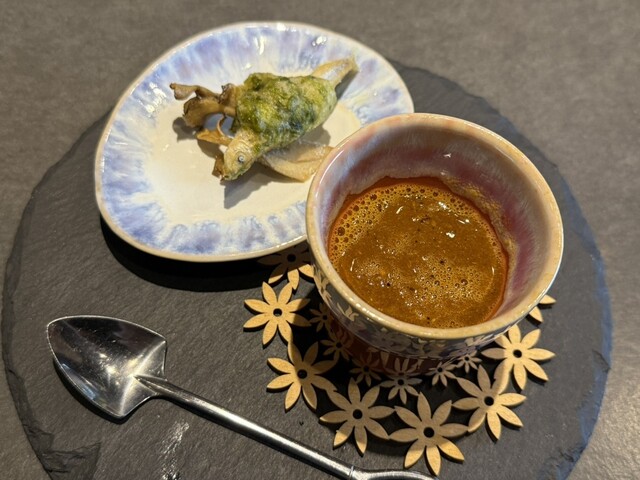 チーズの次に出されたのが「ワカサギのフリットとコンソメ」。サラッと出されて、フリットは一口でパクッと食べてしまったが、ソースと言うかスープが濃厚と言うかしっかりした味付けでインパクトがある。