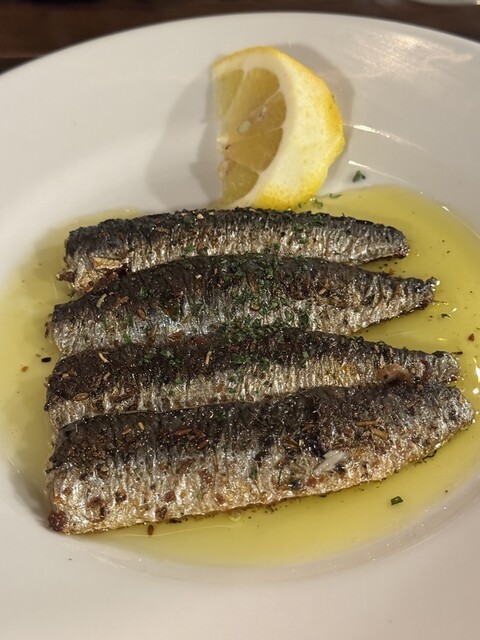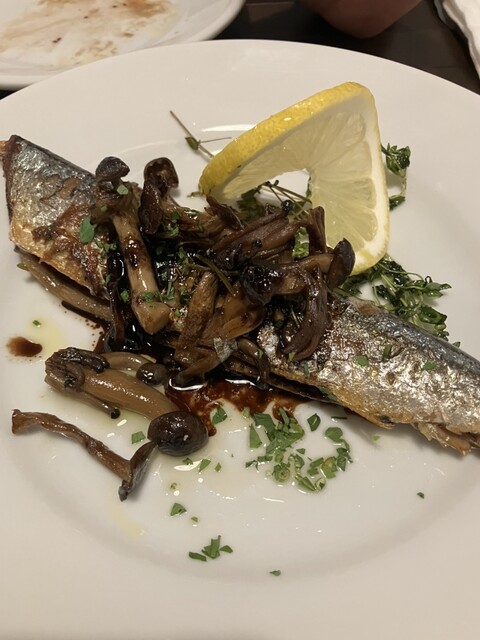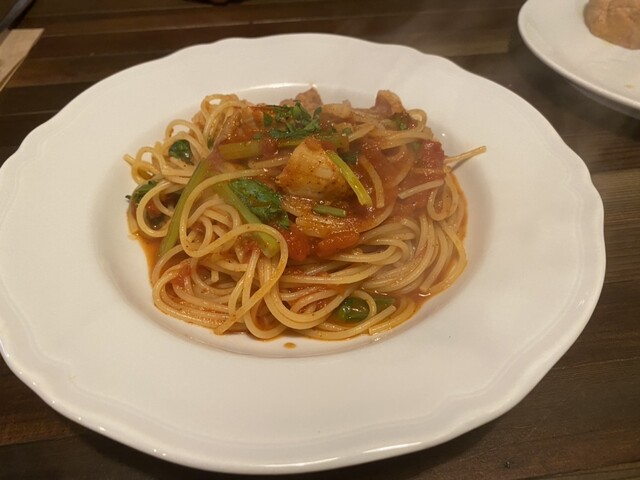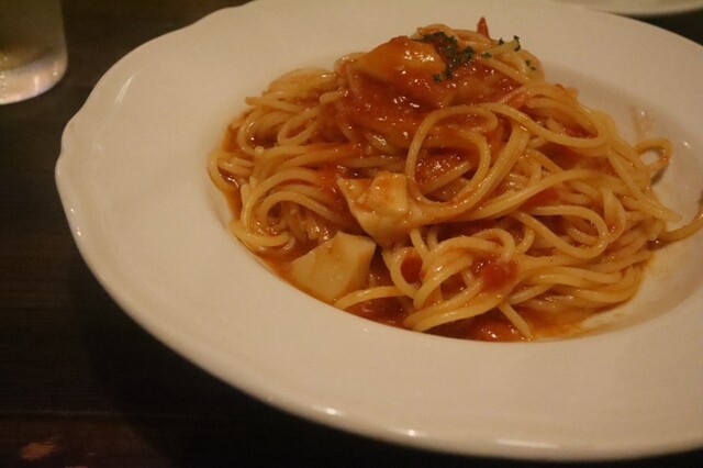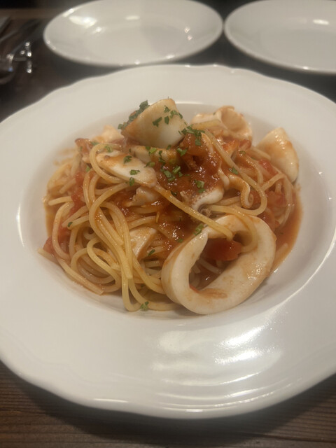 これが本格的な味、イカとレモンのトマトソースパスタ(レモンの皮が具材に)にさんまのコンフィ、...