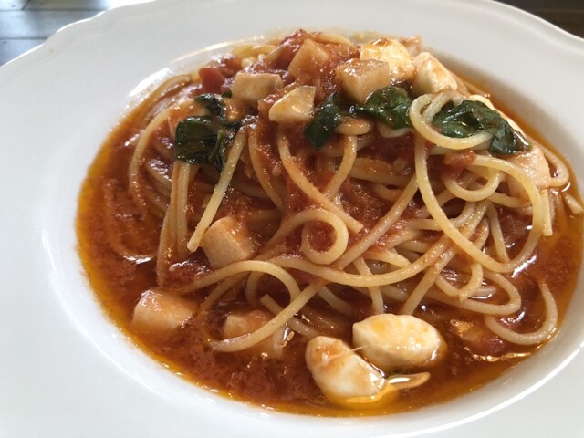 これが本格的な味、イカとレモンのトマトソースパスタ(レモンの皮が具材に)にさんまのコンフィ、...