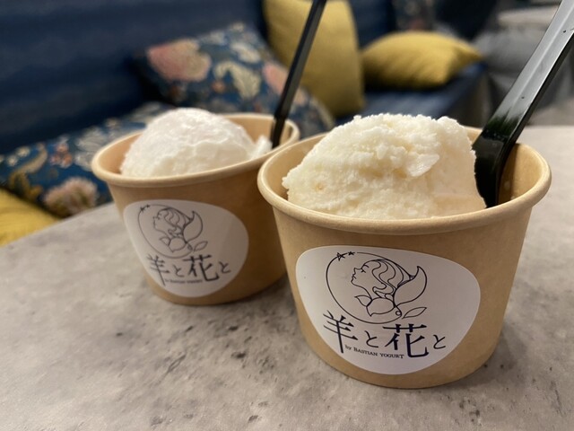 ヨーグルトとシャーベット?(アイス、ジェラート、ソルベ)を提供されている様子。