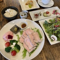 抗生剤・ホルモン剤不使用の彩菜鶏を低温でローストしました。植物性飼料のみで育った臭みのないチキンです。季節のお野菜のサラダにはオーガニックオリーブオイルとバルサミコ酢をドレッシングに! グルテンフリーのライスパスタや自家製デザート、オーガニックのコーヒー・紅茶をご用意しております。 ※おひとり様につき、お飲み物のご注文をおひとつお願いします。