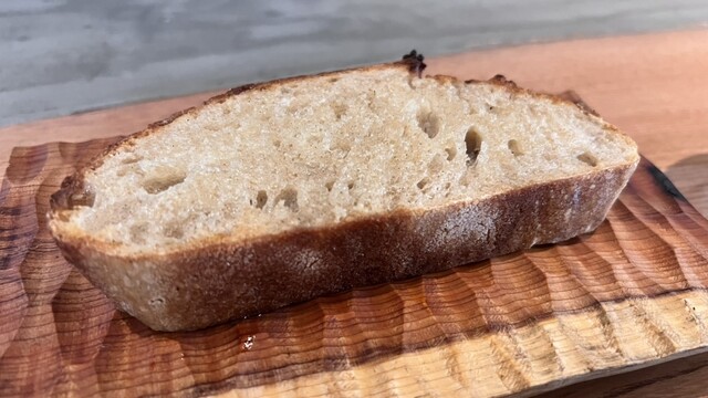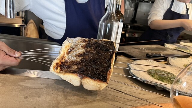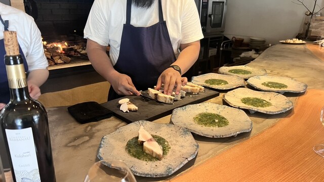 店内はそう広くはなく、緩くカーブしたカウンター席のみ。薪窯が鎮座していてプレゼンテーションが期待できそう。