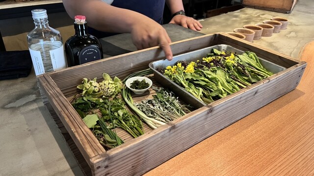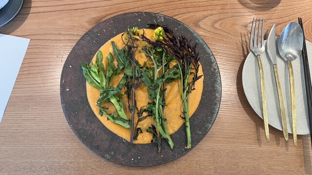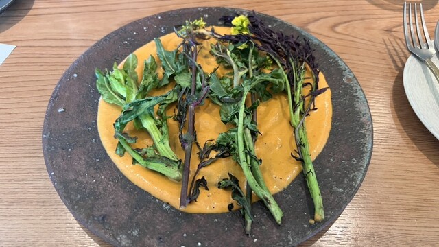 まずは前回同様、森のスープからスタートし、野菜を中心としたお料理が次々と登場。特に印象的だったのは、ローストした野草にオレンジ色のロメスコソースを合わせた一品。もう、このソースはどうなってるんだ?!単体で売って欲しいぐらいw