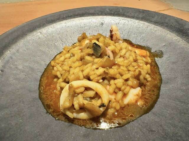 〆の剣先烏賊と海老のアロス カルドソの三皿。