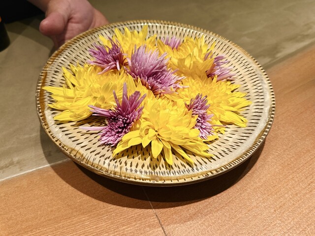 菊花のサラダ 塩揉みしたカブ 樽香を纏わせたビネガー