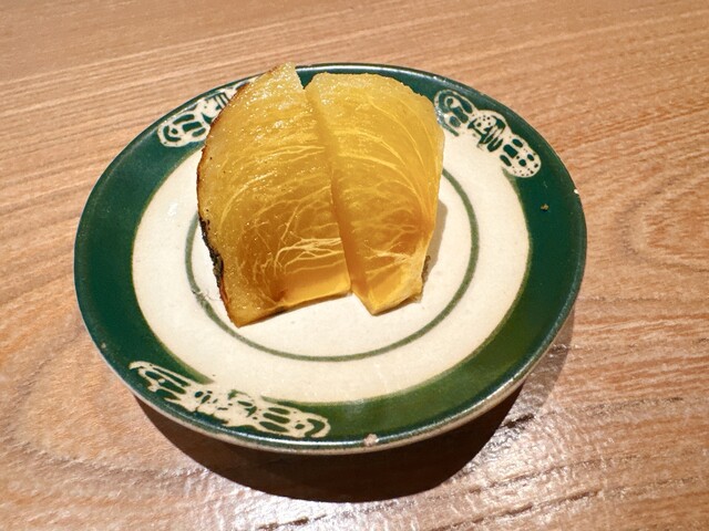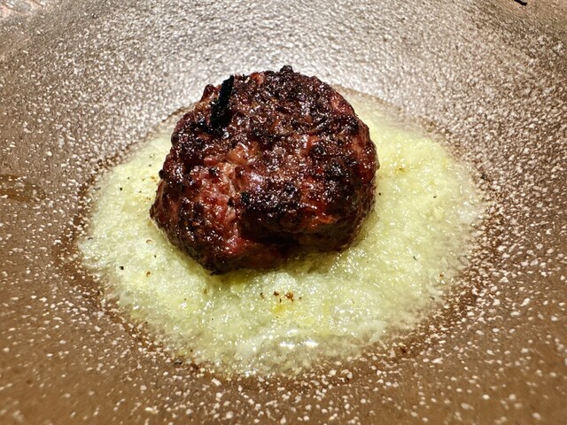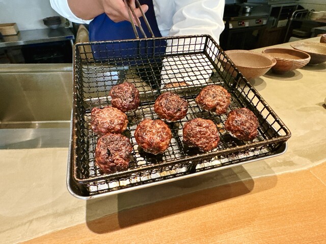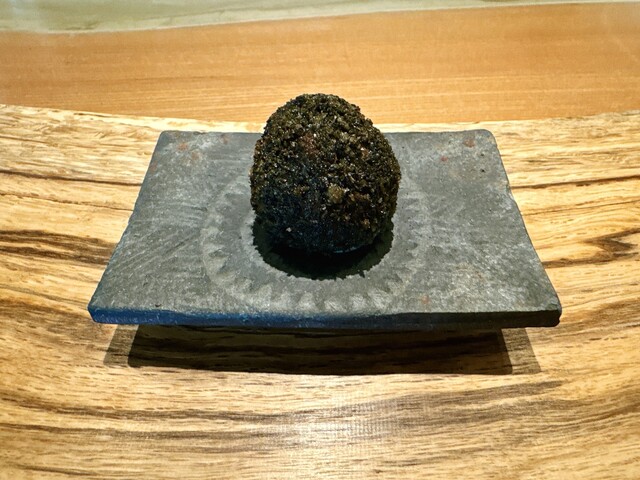 野鳥団子 緑大根:雉鳩と真鴨と小鴨を混ぜ込んだ焼き団子 緑大根を炊いた大根おろし 木の実(キハダ)の香り