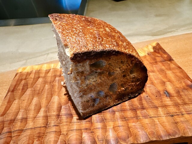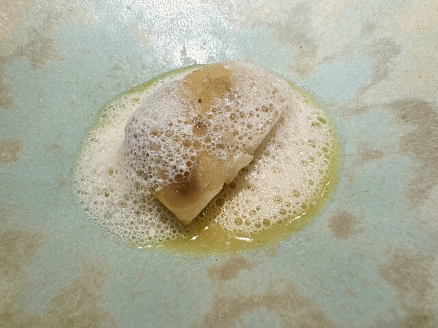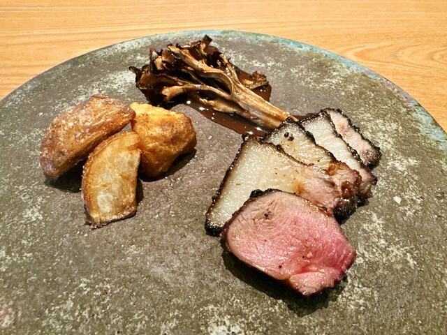 10ヶ月ぶりの再訪。食材そのものの命を感じるプリミティブな料理は更に進化を遂げていた。今回のハイライトは猪 原木舞茸 醬油麴:醤油麹でマリネした猪のチャーシュー 5年の紹興酒の煮切り、原木舞茸の蒸し焼き、皮付きのフライドポテト 五香粉の香り、Arroz con bacalao y puerros:鱈と鱈白子と葱のアロス(米料理)。
