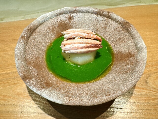 蕪 香箱蟹:蕪の葉と蟹のエキスの出汁と炊いた蕪 野草のオイル 香箱蟹を乗せて
