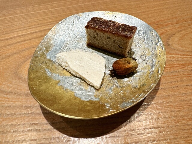 お茶菓子:樹上で完熟したサルナシ、ヤマガタタケモドキのメレンゲ、マカダミアナッツのパウンド・ケーキ