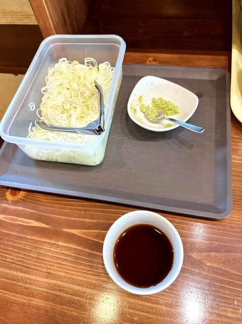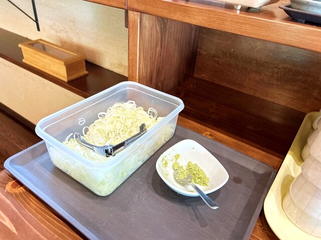 蕎麦を受け取り、蕎麦猪口に汁を入れ、薬味をとって着席