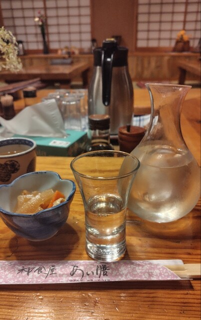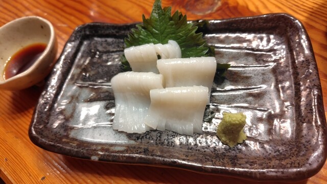 お通しは大根と人参、油揚げの煮物。閉店間際の時間だったため、赤身の馬刺しといか刺し、冷酒を頼んだたけでラストオーダーの時間になってしまった。