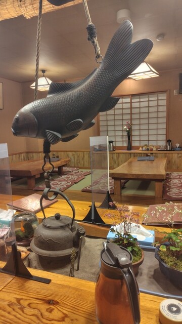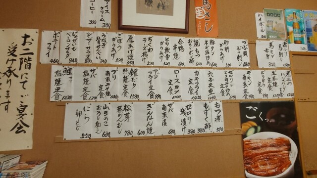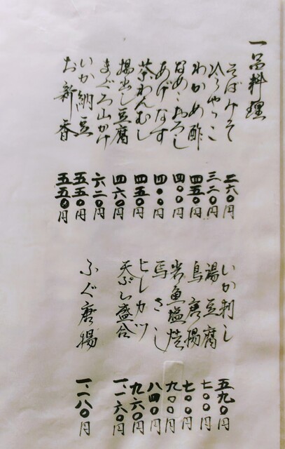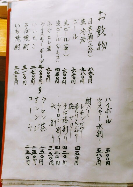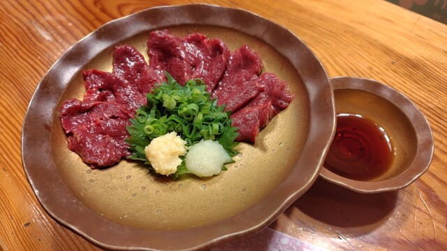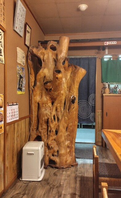 馬さし赤身は薬味におろしたニンニクと生姜、小口切りのネギ。生冷酒は氷ポケット付きのガラス徳利でポケットに氷が一個入って酒を冷してある。日本酒は銘柄が選べなかったが、好みに合う日本酒だったので帰りに訊いてみると佐久市、戸塚酒造の「寒竹」だそう。席料やお通し代はなくて会計は注文の品のみ。店内には巨大な天然木が置かれていて、イチイの衝立だそう。