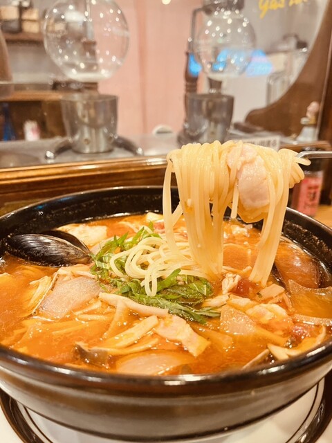 間もなく登場したのは大きな器に並々のスープ。もはやラーメン風というよりラーメンでも良い気もするが、アサリとムール貝が「俺たちはラーメンじゃないよ。パスタだよ。」と主張している。もちろんパスタなのでフォークで食べる訳ですがついつい啜りそうになりました(笑)。
