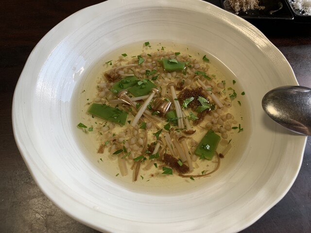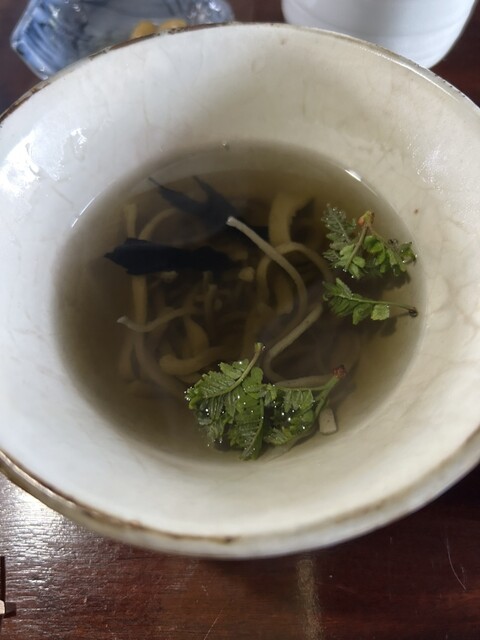 味の濃いしっかりとした歯応えのお豆腐の上には山葵の葉。お蕎麦とからす茸のスープ、無農薬野菜のサラダ、蕎麦の実のリゾット、そして最後に十割蕎麦。