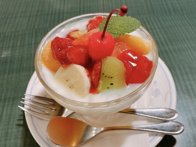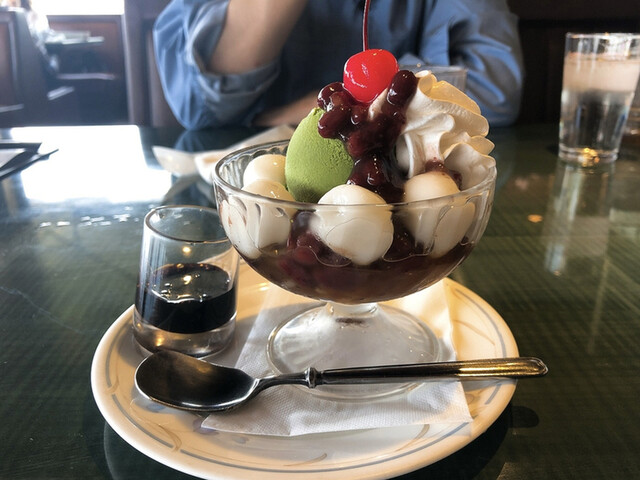 抹茶クリームあんみつ390円、ドリンクバー250円。