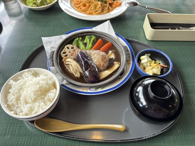今回は和風ハンバーグ定食を注文。鉄鍋で熱々に提供され、ハンバーグはふっくらジュ...