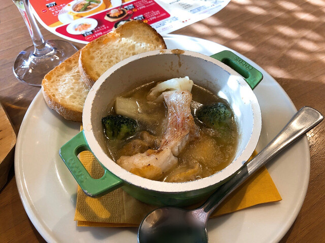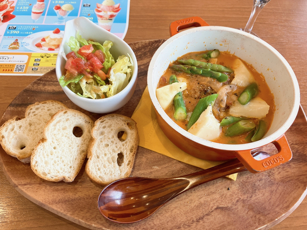 「アスパラとカマンベールのトマトクリームココットハンバーグ」(バゲッ...