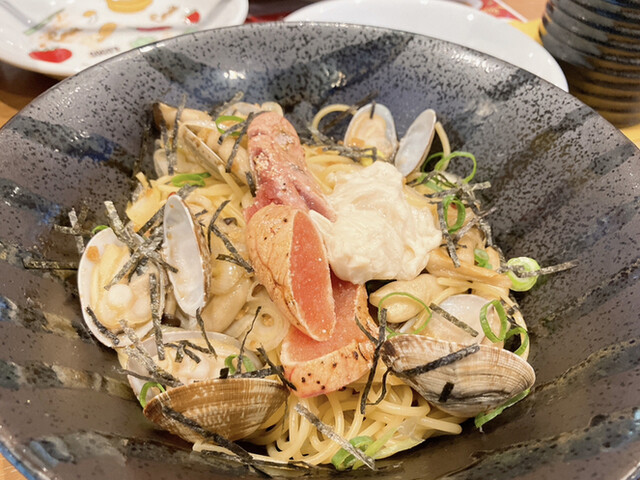 2月限定「2度おいしい! 生湯葉と炙りタラコのお出汁パスタ」990円。