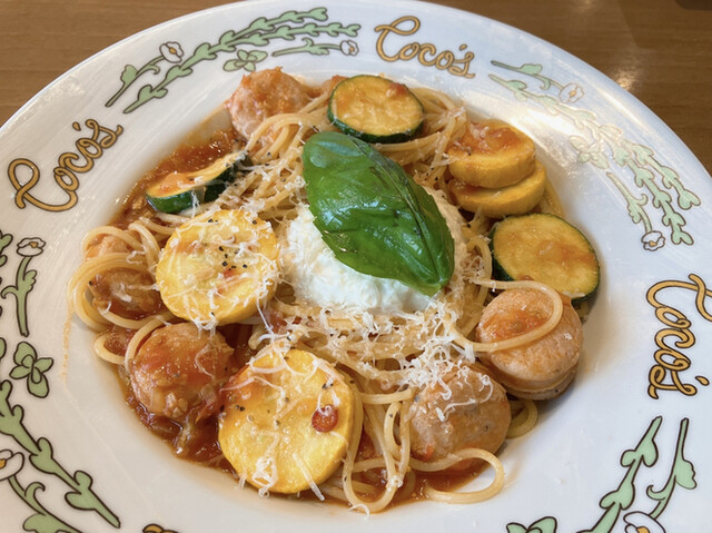 ズッキーニと国産ソーセージのトマトパスタ 〜クリーミーモッツァレラのせ〜