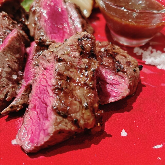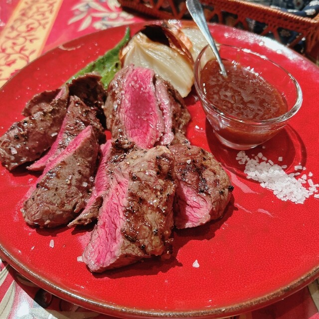 予想以上に美味しかったのが、国産牛のグリル250gです。ミディアムレアな感じの焼き加減に、程よく塩胡椒されていて、そのままで美味しく仕上がっています。そこに岩塩と自家製ソースが添えられているのですが、この自家製ソースが程よい酸味を加えてくれて、更に美味しくなります。