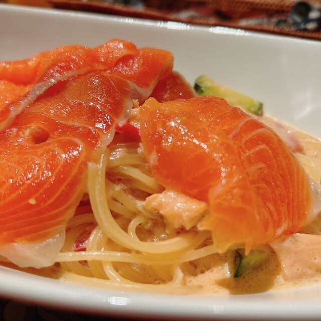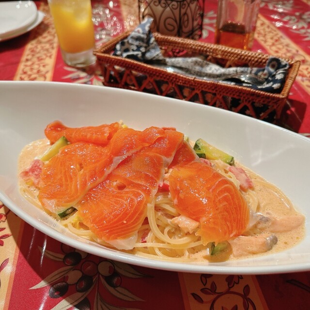 パスタは信州サーモンのトマトクリームを大盛で注文。パスタの上にどどんと乗った生サーモンが目立ちますが、これ以外に火の通ったサーモンも沢山入っています。ズッキーニや白菜も入り、具沢山なパスタです。もちろん美味しいです。