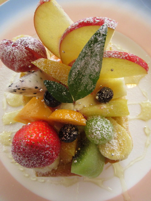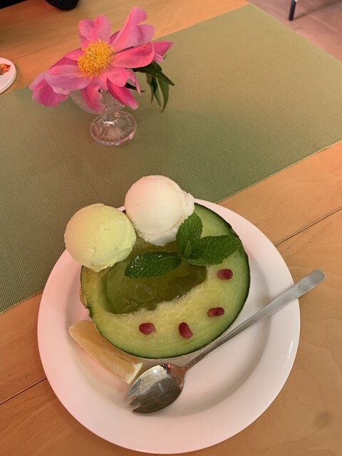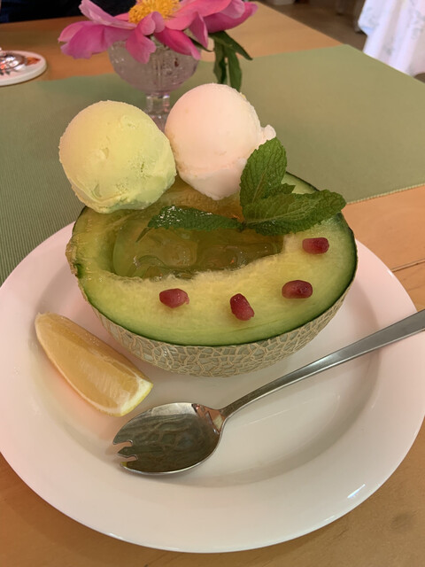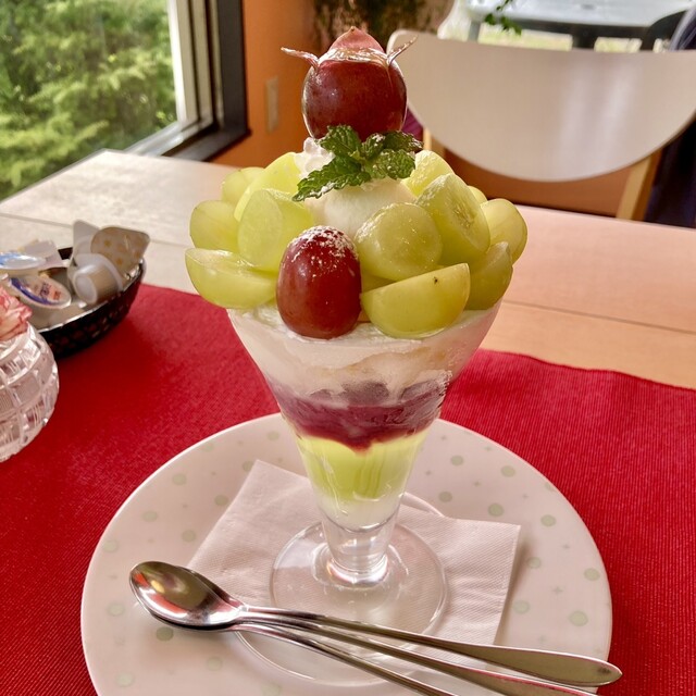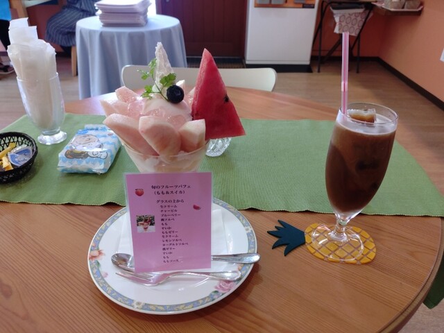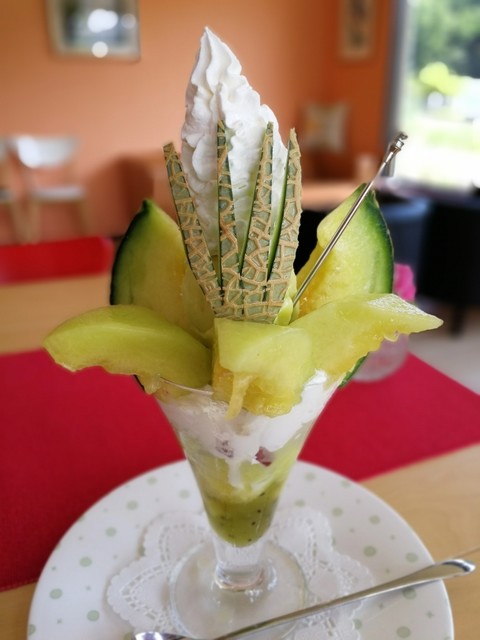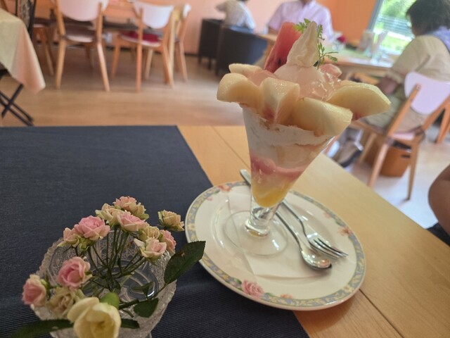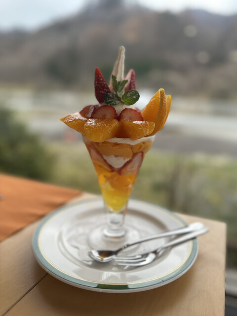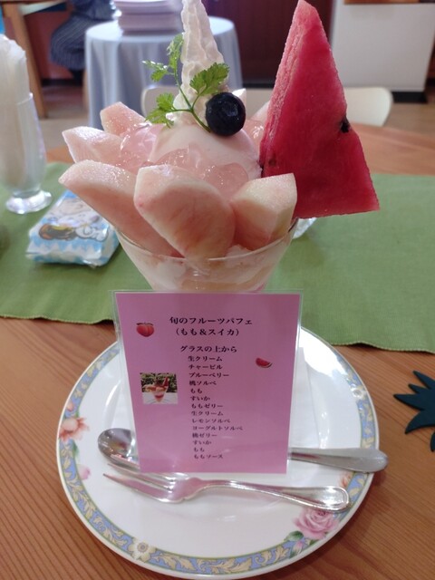とにかくフルーツ満載てした。桃一個まるごとしようした季節のパフェになります。当然ながらお客さんは女性か多くオッサン一人ては肩身狭いですが、近くにあれば通いたいお店てす。パフェ以外にもいろいろメニューかあります。近く行った際にはまたおジャマします。