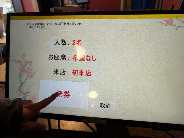 人数、テーブル席、座敷、どちらでもを選び発券。