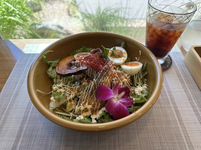 しばらくして着丼、十六穀米の上に鯖の竜田揚げ、揚げ野菜、茹で卵が乗り十六穀米の周りにはサラダ。美味しく頂きました。