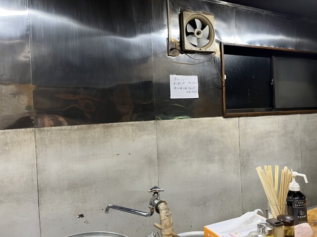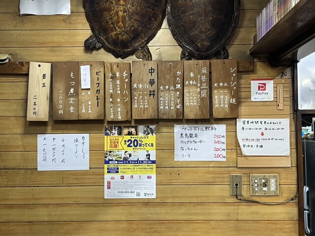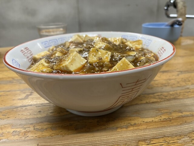 店内はカウンターのみ。少し背の高いバースツールのような席のみ数席の小ぢんまりとしたお店です。メニューは壁に掲示された木札を見て選びます。この日は刺激的なものを食べたい気分。麻婆豆腐をラーメンで注文します。サイズは小(1,200円)。小でも普通のお店の大盛りくらいの量があります。麻婆豆腐丼やライス付き麻婆豆腐にすることも可能です。