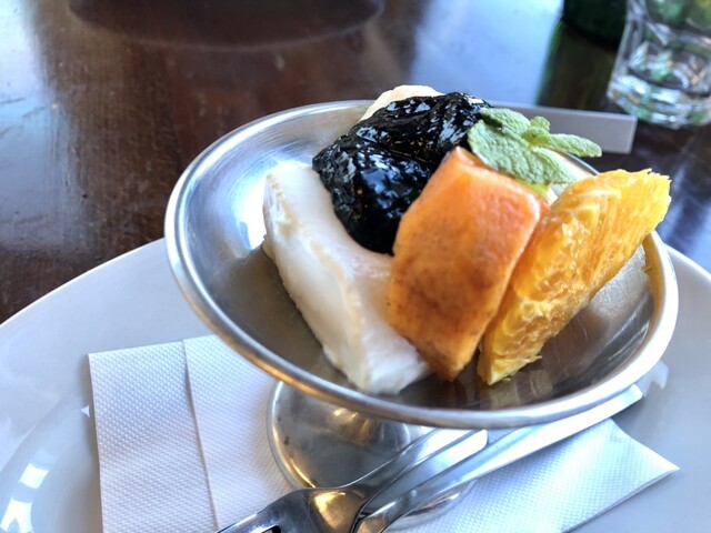 本日のドルチェは、パンナコッタ、ブルーベリーソース添え。軽めでしたので、なんとか食べ切れました。食べ終わった時には満腹でした。