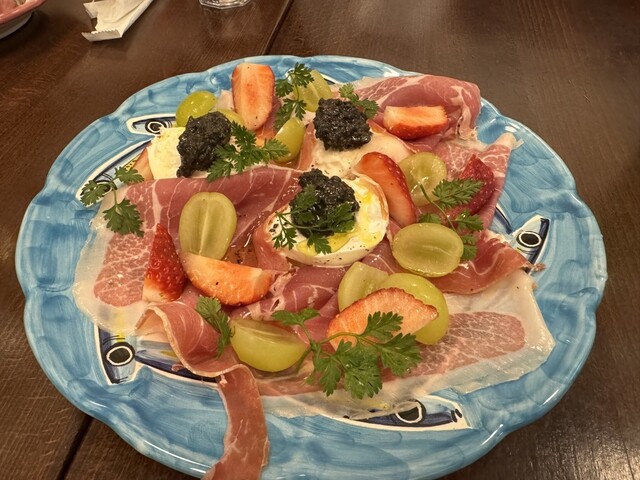 ・前菜として、ブッラータチーズと生ハム、シャインマスカット、苺、トリュフペースト