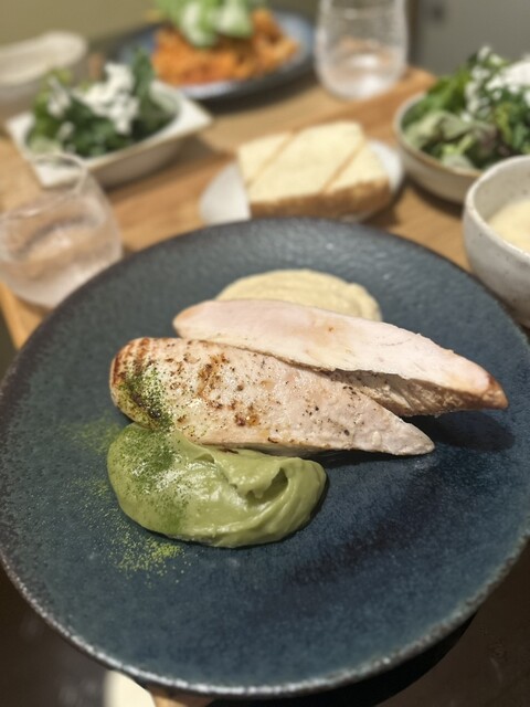 ・鶏ムネ肉のロースト、抹茶のポテトピューレと筍のソース