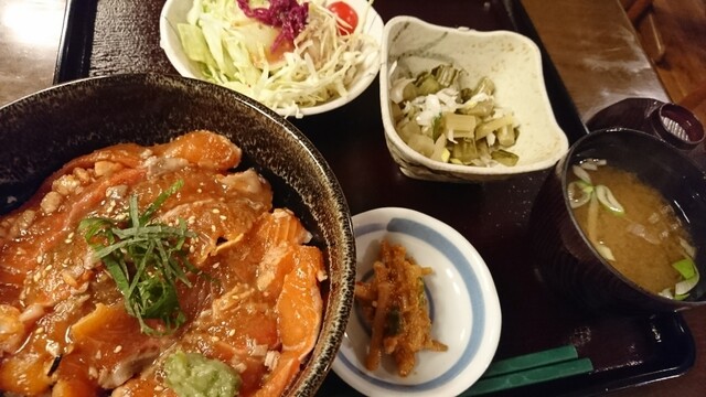 今回は信州サーモン丼をオーダーしてみました!小鉢や味噌汁もついて1300円程。
