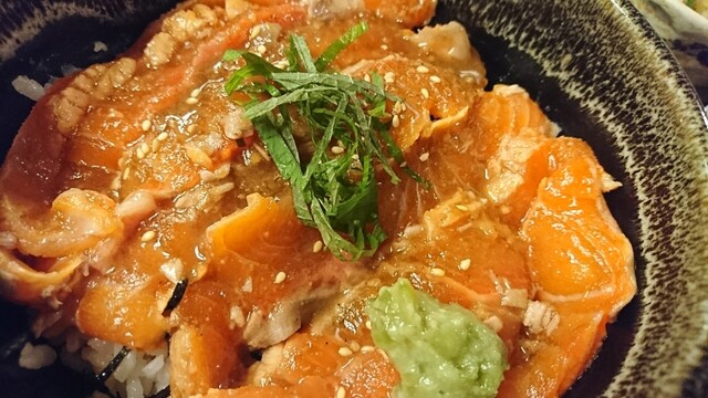 ぎっしりと敷かれたサーモンの上にはわさびではなく、わさび漬けがトッピング。ピリッとしますね~