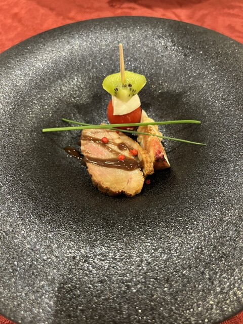 合鴨は合鴨独特の風味も無く、モッツァレラチーズとプチトマトを爪楊枝で刺したカプレーゼ。