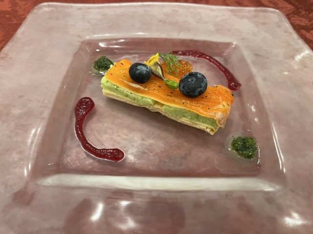 さて、次に運んでいただいたのが、信州サーモンのミルフィーユ。