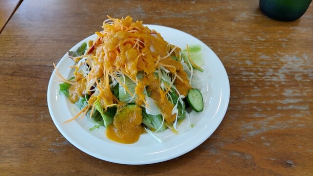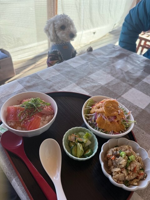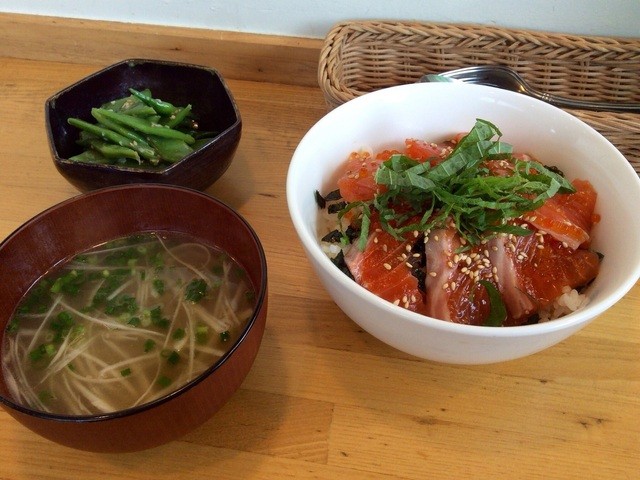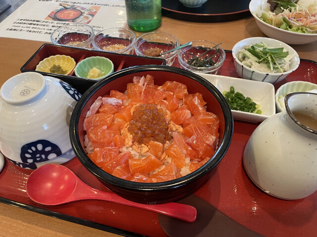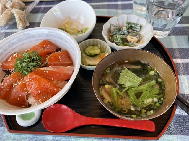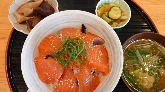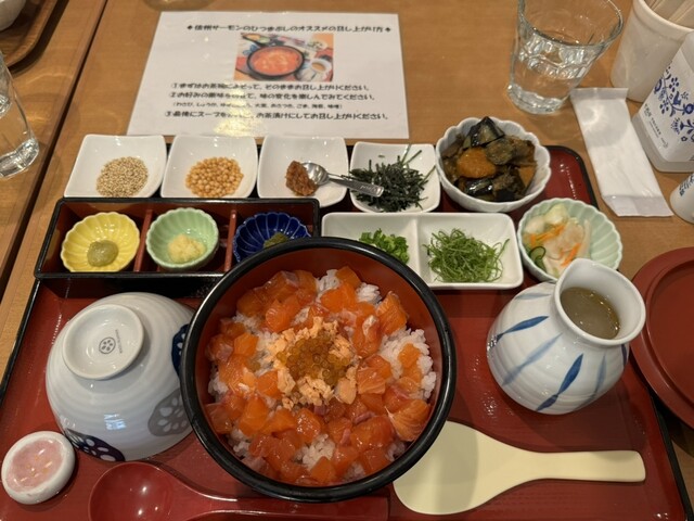信州サーモン丼を注文しました。サラダの量が結構あり、ニンジンベースのドレッシングでした。菜の花のからし合えはしっかりとした味付けでした。サーモンはつけてあるのか、味がしみてて、ご飯もすすみました。味噌...