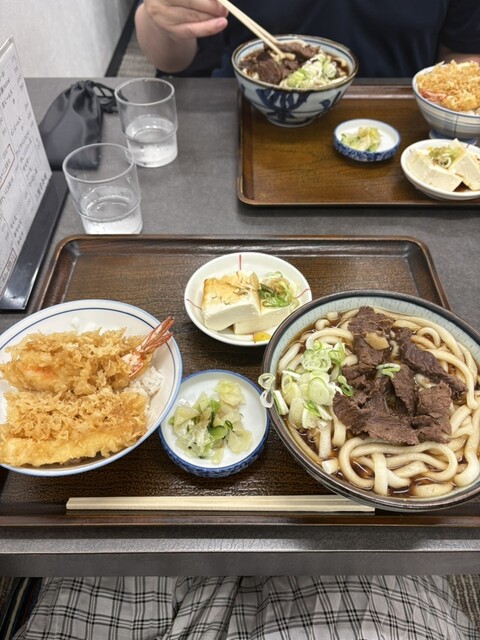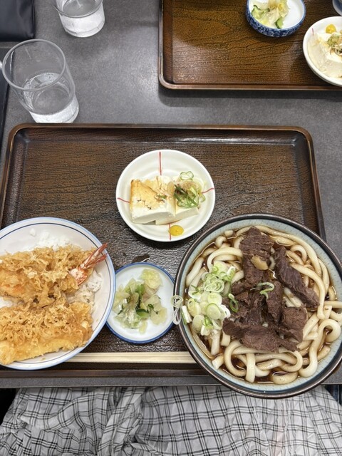 待つこと5分でお盆に載って、馬肉うどん、ミニ天丼、冷奴、漬物が到着。