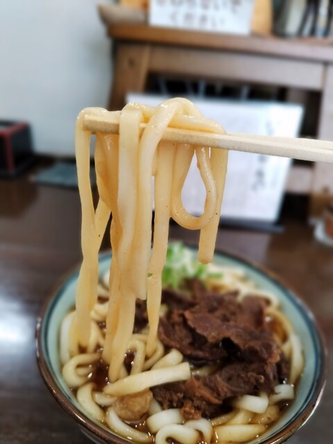 馬肉はひとくち大のものが数枚入っている。長時間煮込まれたからか、肉質は締まって歯ごたえがある。うどんは柔らかくてふにゃつとしていた。