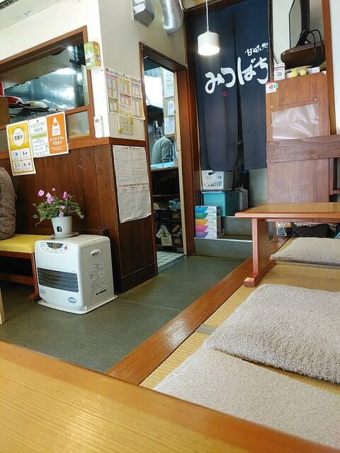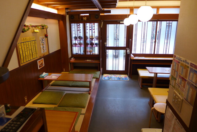 店内は4人がけのテーブルが2卓とカウンターが2席、4人がけの座卓が2卓。