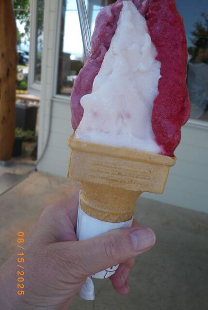 この日の小諸市の気温は、33℃。前の高齢者のお客さんがお孫さんに、トリプルコーンを購入。これは危ないぞ!と思っていたら、半数以上を床に献上。。。