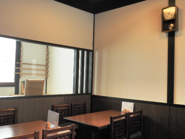 小体な店で、右に椅子席、左がカウンターと調理場、奥が電動石臼のある蕎麦打ち部屋。