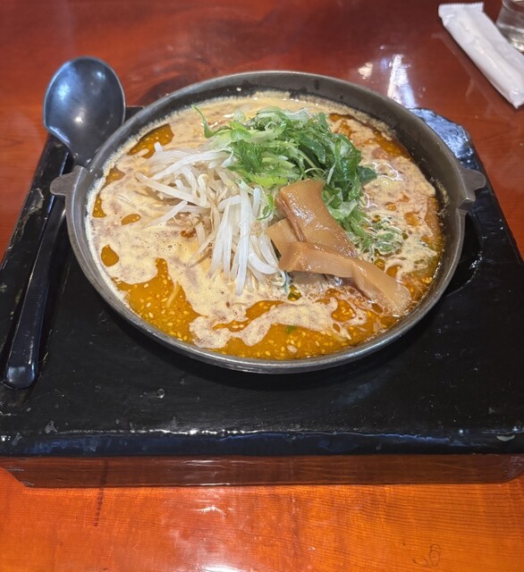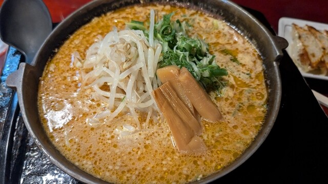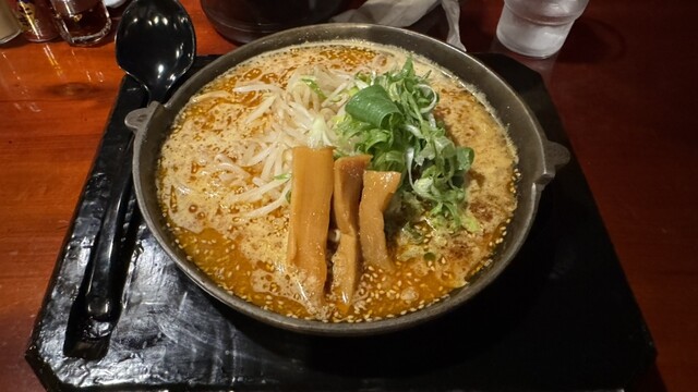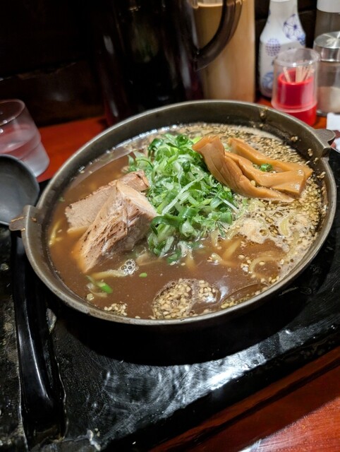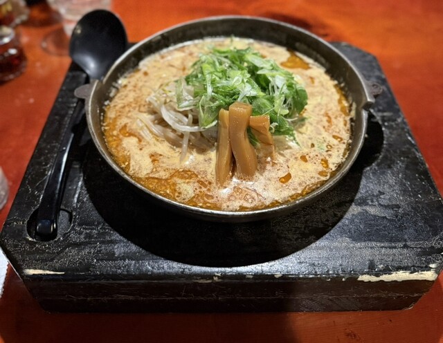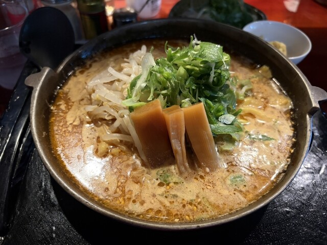 焼き味噌ラーメンは鉄鍋であつあつ。
