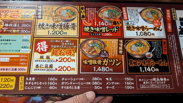 メニューは、味噌焼き、白味噌、とんこつ味噌等などメニューはたくさんです。