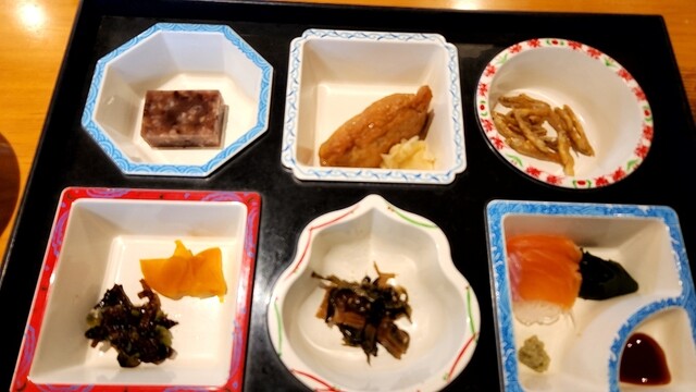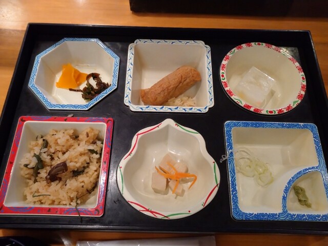 いただいた御膳はいろいろバラエティに富み、蕎麦いなりや蕎麦の実入り水羊羹は、お蕎麦屋さんならではの一品ですね。