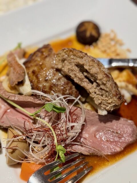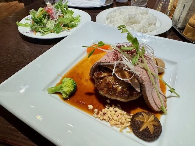 いつものガーリックステーキに、連れは大人のハンバーグ。サラダを追加注文すると、その場で盛り付けてくれる。レタスは細かく切られていて食べやすく、そして凄いシャキシャキ✨